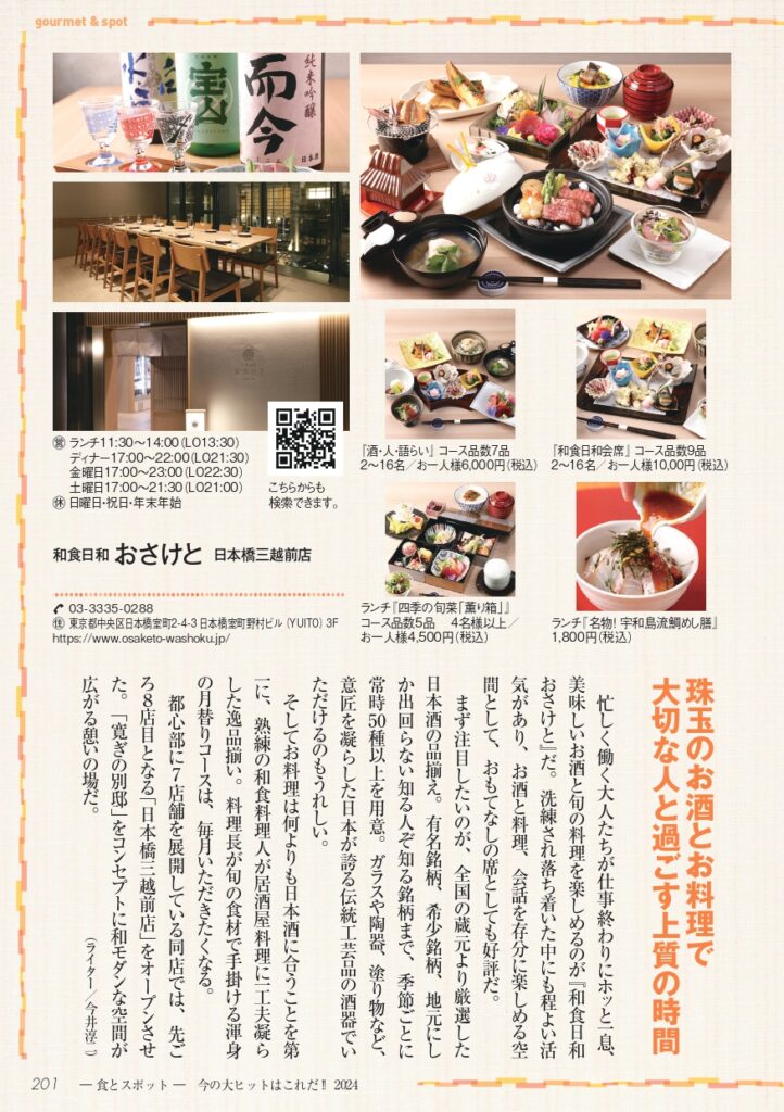2024.07.08 【メディア掲載】雑誌「今の大ヒットはこれだ!! 2024年版」 日本全国の注目の情報見つけに、流行の最前線をいく雑誌、「今の大ヒットはこれだ!! 2024年版」にて、和食日和おさけと日本橋三越前をご紹介いただきました。日本酒やお料理はもちろん、こだわりの酒器まで触れていただいています。ぜひご一読ください。 日本酒に賞味期限はない?おいしく飲める期間・保存方法などについて解説 日本酒の賞味期限や保存方法について解説