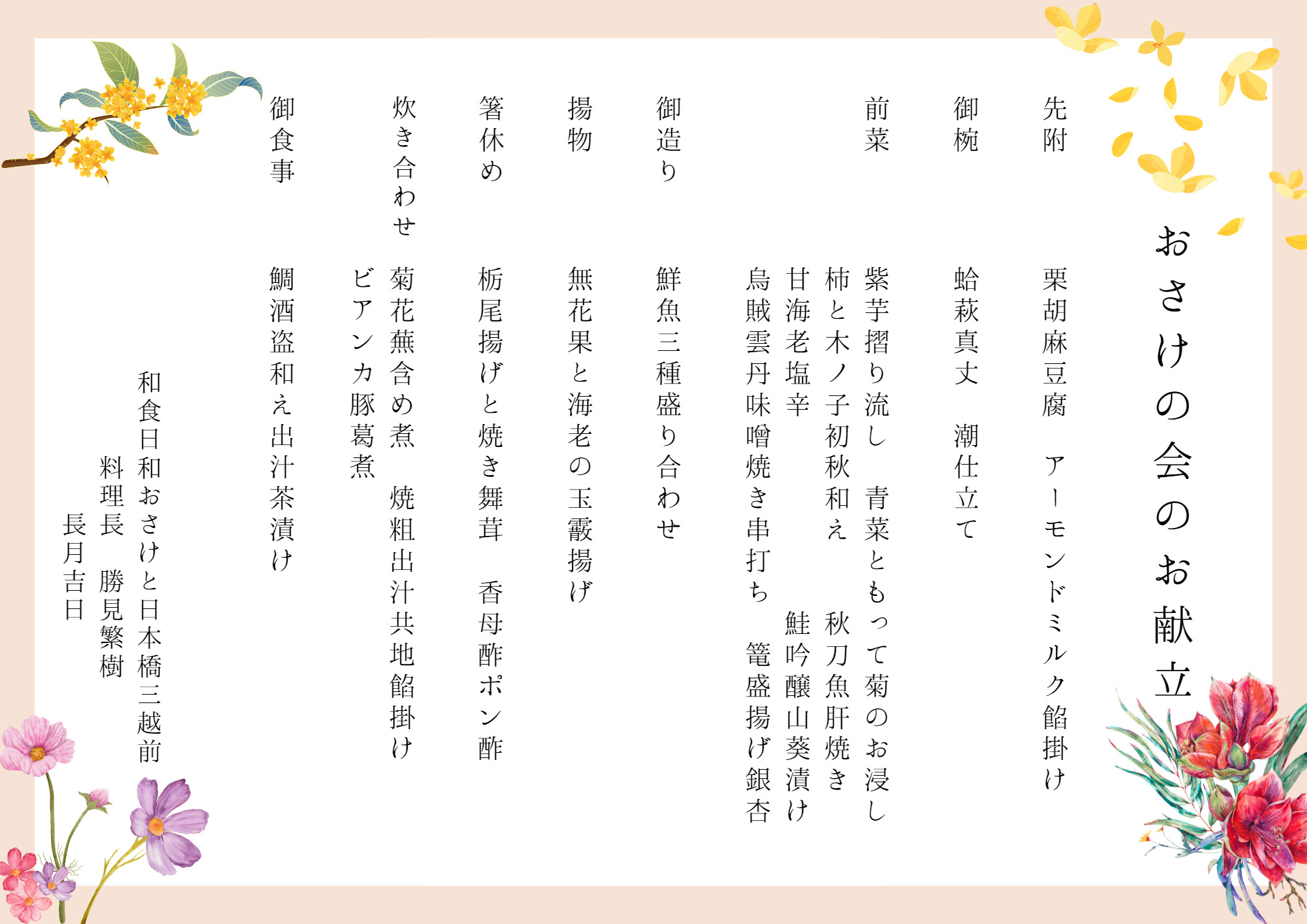 今回のおさけの会だけのスペシャルコースの献立が決定いたしました!