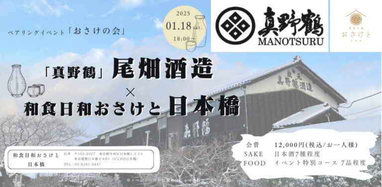 2025年01月18日 日本酒と和食の至高のペアリングをお楽しみいただくイベント「おさけの会」。 2025年一番最初の「おさけの会」は新潟県は佐渡から、尾畑酒造さまをお迎えいたします。尾畑酒造さまの酒造りのモットーは、「 … 続きを読む 【おさけの会のお知らせ】「真野鶴」尾畑酒造×和食日和おさけと 日本橋