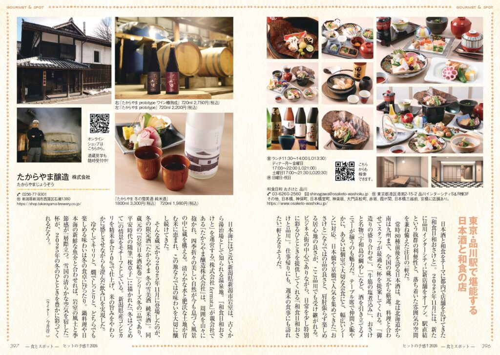 2025.11.08 【メディア掲載】ヒットの予感‼2026年度版 2025年11月7日(金)発売の雑誌「ヒットの予感‼2026年度版」に、今月11月12日グランドオープンの「和食日和おさけと品川」が、「旬の食と2026年に行きたい話題のスポット」として掲載されました。 品川店の魅力に迫った内容となっています。ぜひご一読ください。 〔おさけの会〕福光屋×和食日和おさけと品川 〔おさけの会〕長谷川酒造×和食日和おさけと京橋 〔おさけの会〕若鶴酒造×和食日和おさけと赤坂 〔おさけの会〕つけたろう×りんく×和食日和おさけと霞ヶ関 〔おさけの会〕石井酒造×和食日和おさけと霞ヶ関