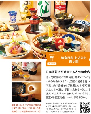 虎ノ門駅直結の「霞ダイニング」にある和食レストランとして、一流の料理人が仕上げた本格和食と、常時50種以上の品揃えが魅力的な日本酒を個室や半個室でゆっくりと味わえます。