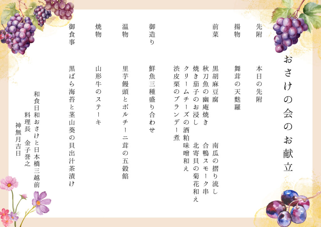 【おさけの会の献立が決定いたしました】高畠ワイナリー×和食日和おさけと日本橋三越前