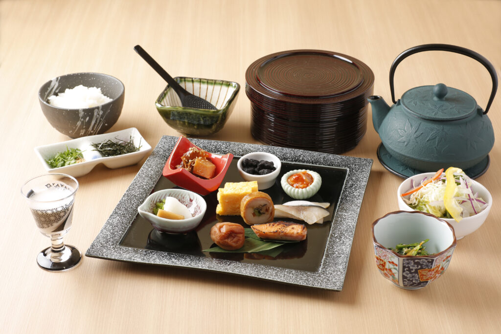(一例: 鯛胡麻和え、牛時雨煮、梅干し 鮭小串、玉子焼き、炙り明太 大徳寺納豆、新香、鯖へしこ)