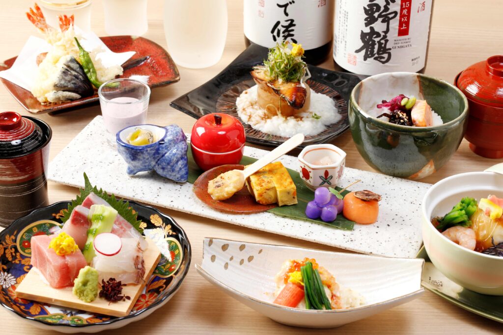 日本酒との相性も抜群の旬会席。バランスの良い料理構成で銘々盛りでご提供しますので、ご接待にもおススメです。