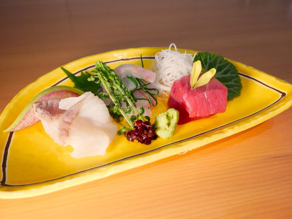 スズキの洗い、平目の杉盛り、マグロ刺身