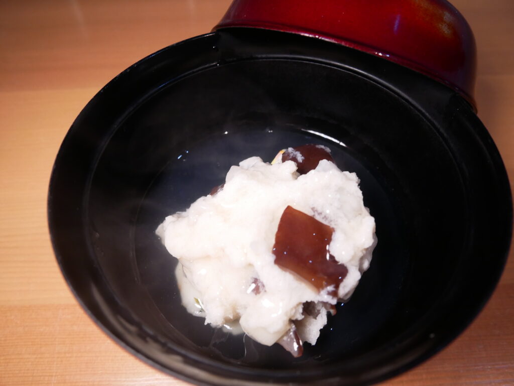 糸撚鯛蓮蒸しは、蓮根のすりおろしを卵白と混ぜ合わせ、きくらげや蓮根(固形)などといっしょに蒸して真丈のようにしたものを、銀餡とともにお召し上がりいただきました。