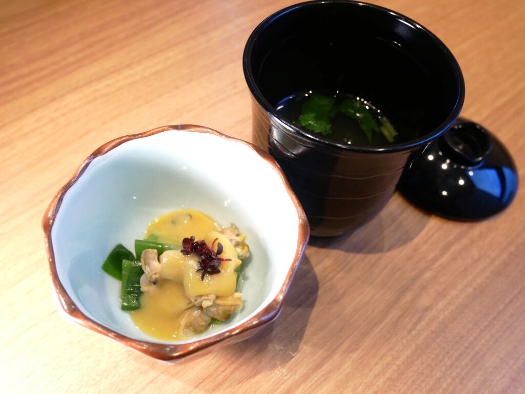 甘味のある九条ネギとほろ苦い旨味のある浅利を、やや甘めの酢味噌とともに。