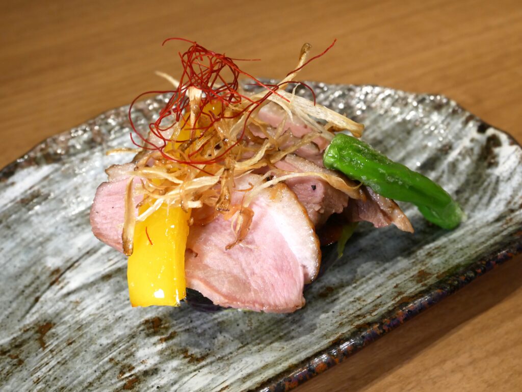 低温調理されて肉の旨味がぎゅっと詰まった鴨のローストと、「京の伝統野菜」である賀茂なす。