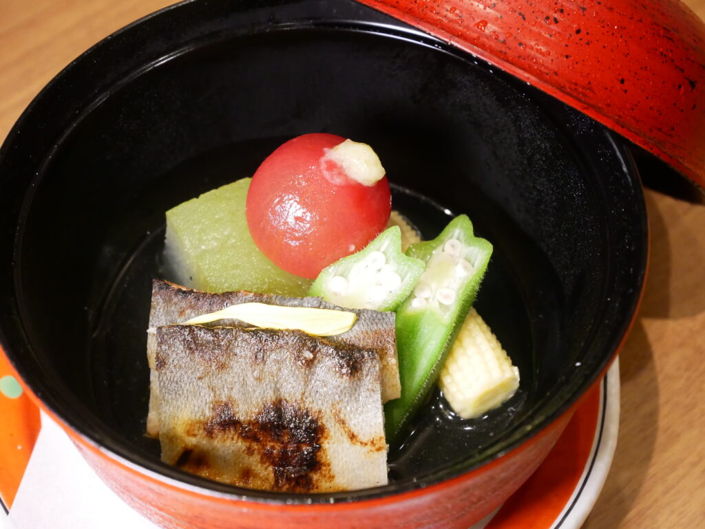 御椀は最早おさけと名物と言っても過言ではない、旨味のつまった真鯛の潮汁。