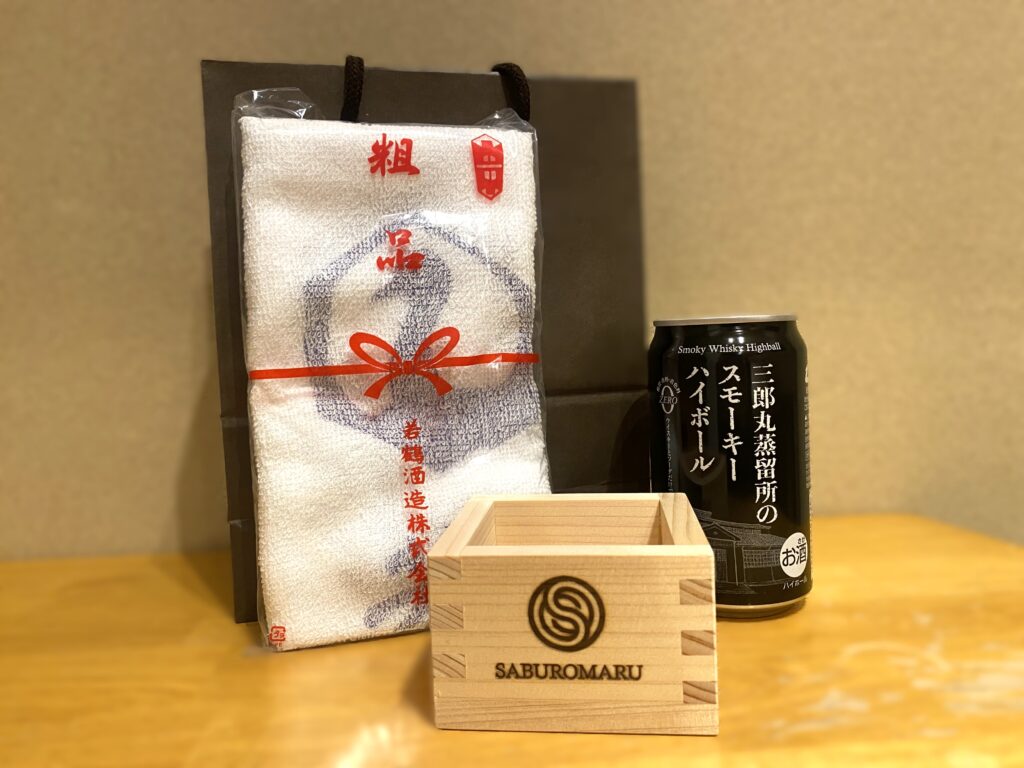 当初お土産はハイボール缶のみの予定でしたが、なんとタオルと枡までご用意してくださいました!