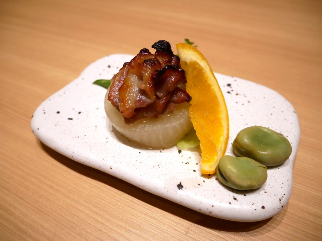 翡翠豆桝盛りの枡は大根をくり抜いた、枡ごと食べられる一品でした。